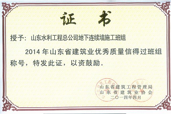 九游娱乐(NINE GAME)官方网站“地下连续墙施工班组”荣获2014年山东省建筑业优秀质量信得过班组称号