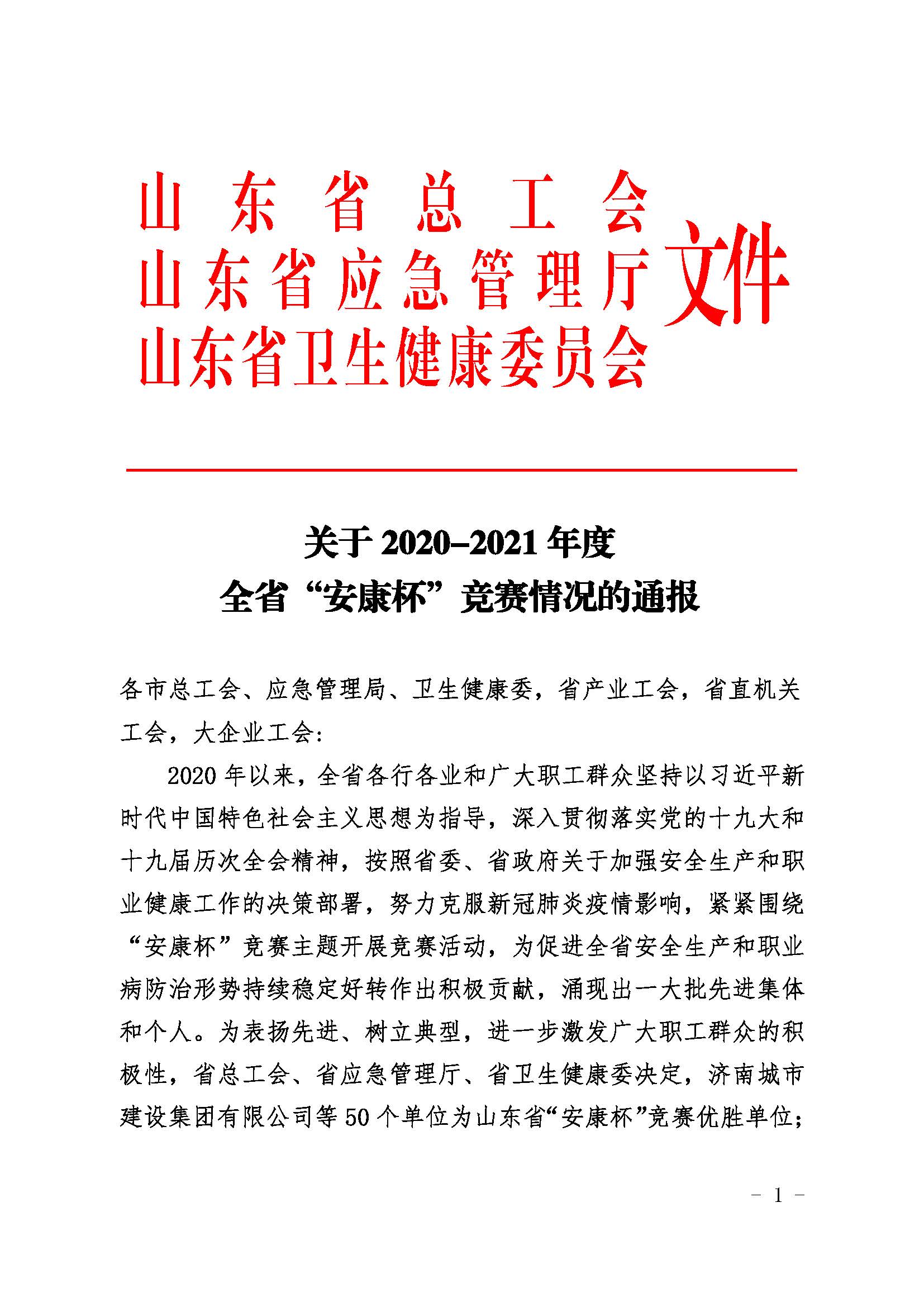 近日,山东省总工会、山东省应急管理厅和山东省卫生健康委员会联合印发文件,通报了2020-2021年度全省“安康杯”竞赛活动结果,九游娱乐(NINE GAME)官方网站荣获全省“安康杯”竞赛优胜单位称号。
