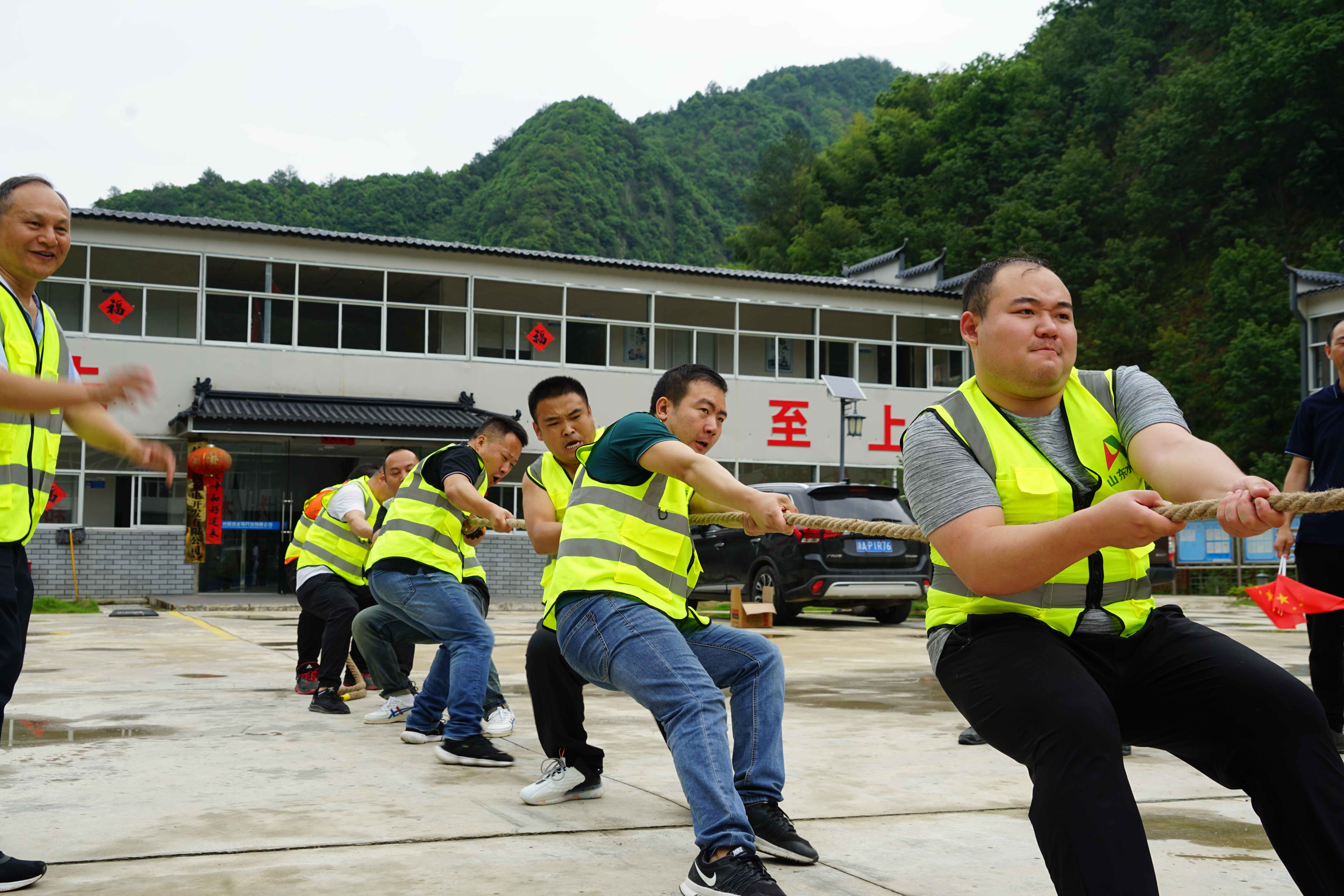 双溪口水库工程指挥部、杭州鲁润九游娱乐(NINE GAME)官方网站和监理部组成蓝队,总承包项目部组成红队,施工班组组成黄队。哨声一响,选手们立即投入到激烈的比赛中,个个精神抖擞、全力以赴,周围观众和工作人员使出浑身解数呐喊助威,赛场气氛热闹非凡、紧张激烈,加油声、欢呼声此起彼伏。最后,经过8轮的比拼,蓝队获得本次拔河比赛的冠军。