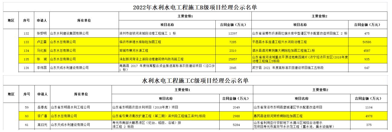 近日,中国水利企业协会发布《2022年水利水电工程施工项目经理评价等级公示》,我九游娱乐(NINE GAME)官方网站卢正雷、马化振、张斌三名同志被评为“2022年水利水电工程施工B级项目经理”,李广喜被评为“2022年水利水电工程施工C级项目经理”。