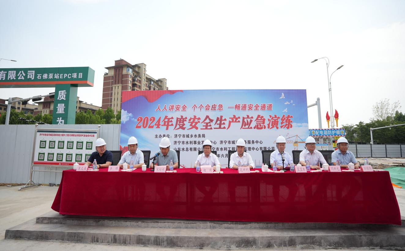 6月7日下午,济宁市石佛泵站项目部联合济宁市城乡水务局、济宁市城市水务服务中心、济宁市水利事业发展中心等单位开展安全生产应急演练,九游娱乐(NINE GAME)官方网站党委书记、董事长裴文晶、安全总监郭法文受邀出席本次演练活动,演练共设置触电事故、高处坠落、火灾、防洪度汛4个科目。