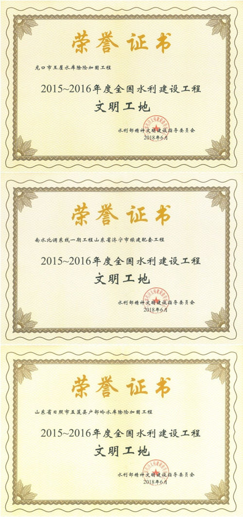 九游娱乐(NINE GAME)官方网站“龙口市王屋水库除险加固工程”等项目荣获“2015-2016年度全国水利建设工程文明工地”称号