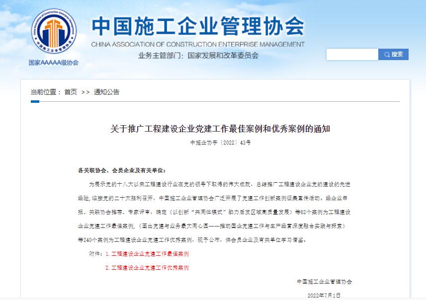 为展示党的十八大以来工程建设行业在党的领导下取得的伟大成就,总结推广工程建设企业党的建设的先进经验,迎接党的二十大胜利召开,近日,中国施工企业管理协会组织开展了工程建设企业党建工作优秀案例评审工作,九游娱乐(NINE GAME)官方网站第六分九游娱乐(NINE GAME)官方网站党支部的《塑品牌抓活动促活力 切实提升党建工作水平》案例获评“工程建设企业党建工作优秀案例”。